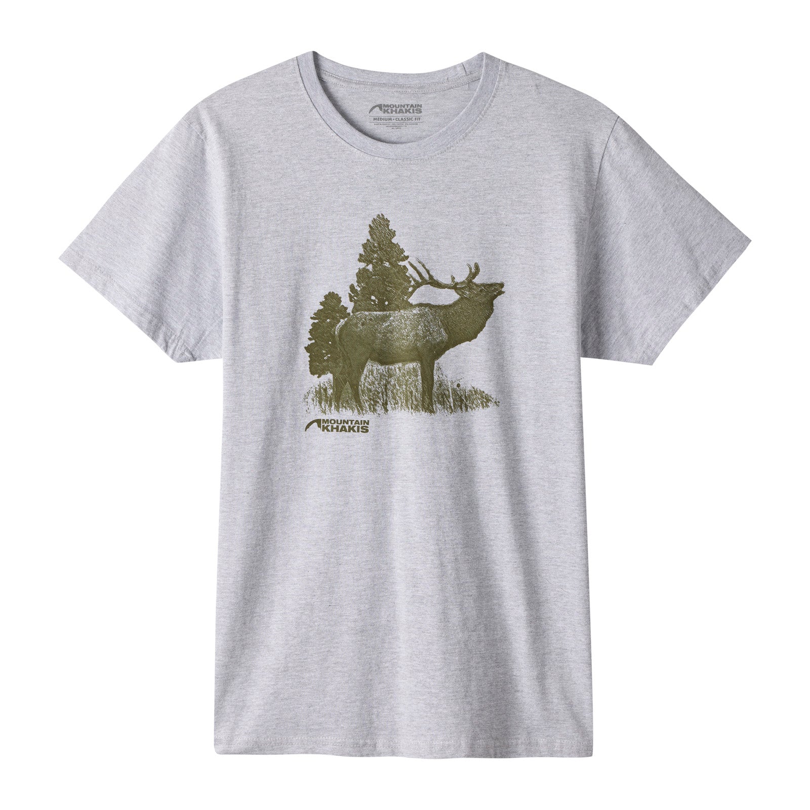 Our Heather Grey Elk Tee combines comfort with classic style. Made from a soft, breathable blend of 90% cotton and 10% polyester, this tee features a cool, vintage-inspired elk graphic. The heathered fabric adds subtle texture, while the timeless design makes it perfect for both outdoor adventures and laid-back weekends.